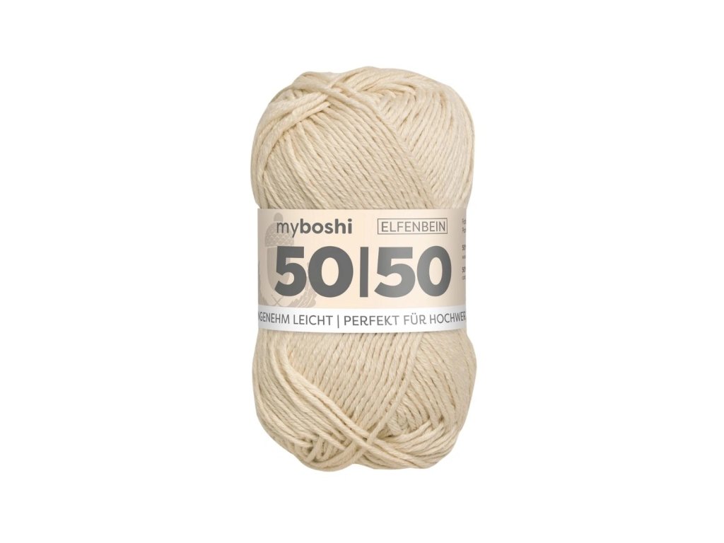 Myboshi 50/50 je exkluzívna zmes vlny merino a bavlny s hebkým povrchom. Vyrába sa z vlny merino bez mulesingu (bezbolestné zpracovanie vlny) a odolnej bavlny. Vďaka kombinácii týchto dvoch materiálov je priadza 100% prírodná, udržateľná a práca s ňou je príjemná a jednoduchá. Udržuje sa jednoducho a je možné ju prať v pračke na šetrný cyklus.