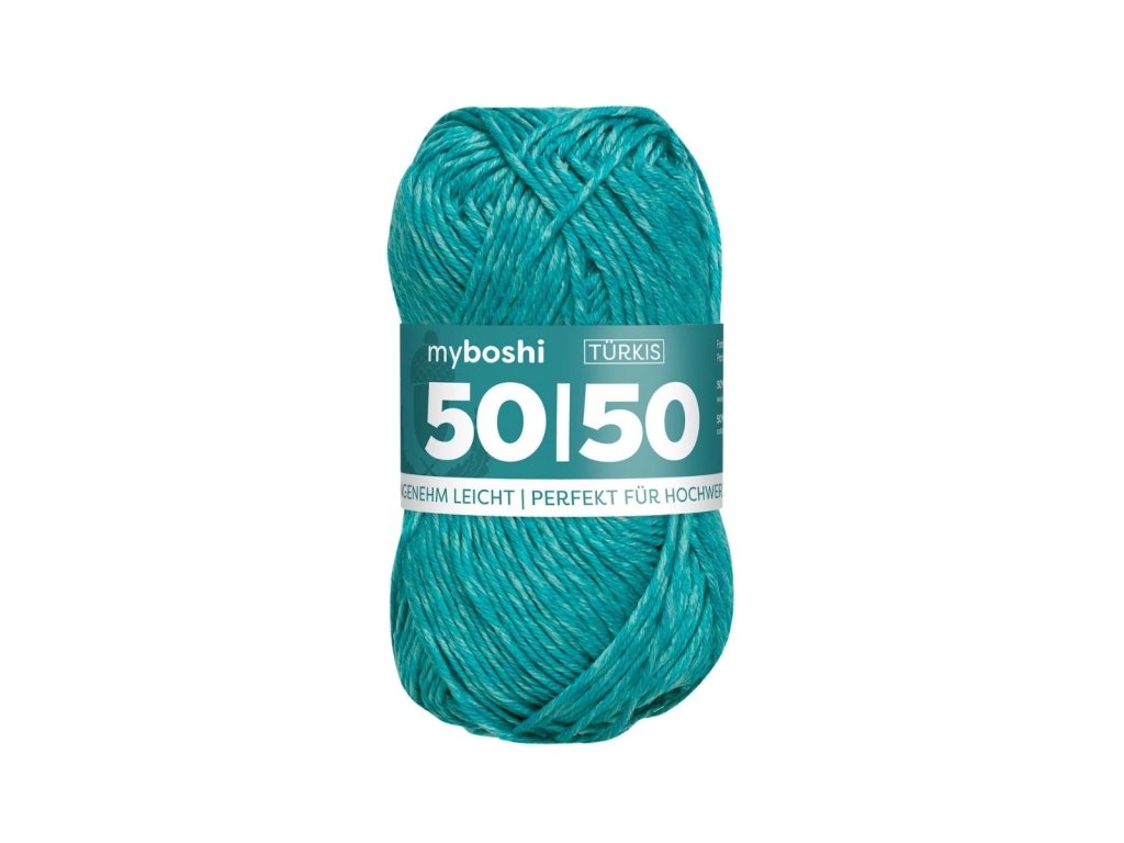 Myboshi 50/50 je exkluzívna zmes vlny merino a bavlny s hebkým povrchom. Vyrába sa z vlny merino bez mulesingu (bezbolestné zpracovanie vlny) a odolnej bavlny. Vďaka kombinácii týchto dvoch materiálov je priadza 100% prírodná, udržateľná a práca s ňou je príjemná a jednoduchá. Udržuje sa jednoducho a je možné ju prať v pračke na šetrný cyklus.
