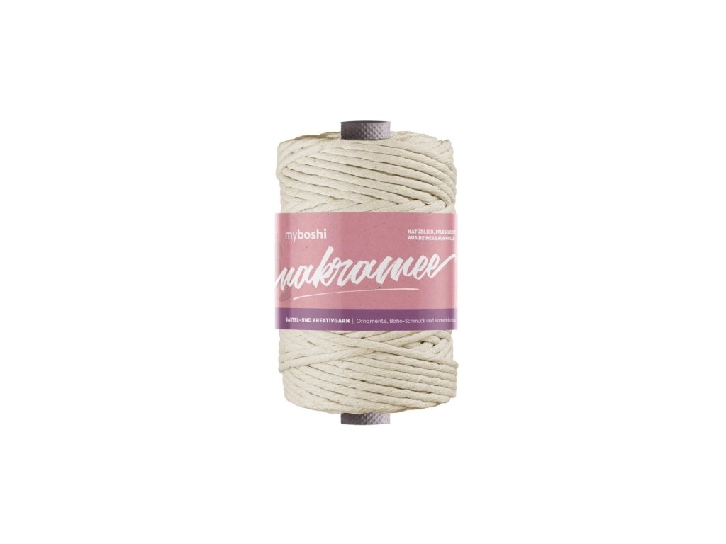 Krútená priadza myboshi Makramee je prírodný produkt prémiovej kvality vyrobený zo 100% bavlny. Vyrába sa v Nemecku a v hrúbke 4mm je na klbku namotaných 50 m šnúry.