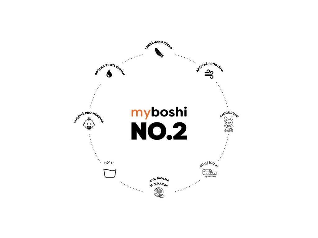 Odporúčaná veľkosť háčika u tejto priadze je 4, avšak pre jemné projekty amigurumi sa pre myboshi No.2 najlepšie hodia háčiky o sile 2,5 až 3,5 mm.