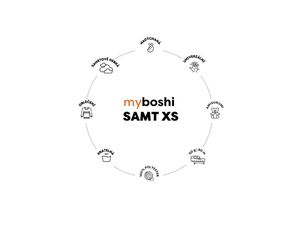 Myboshi SAMT XS je vysoko kvalitná žinylková priadza zo 100% polyesteru. Je veľmi príjemná na dotyk a ponúka nespočet kreatívnych možností. Bola špeciálne vyvinutá pre tvorbu mini plyšákov, amigurumi a domácich dekorácií a zaujme svojou zamatovou textúrou.